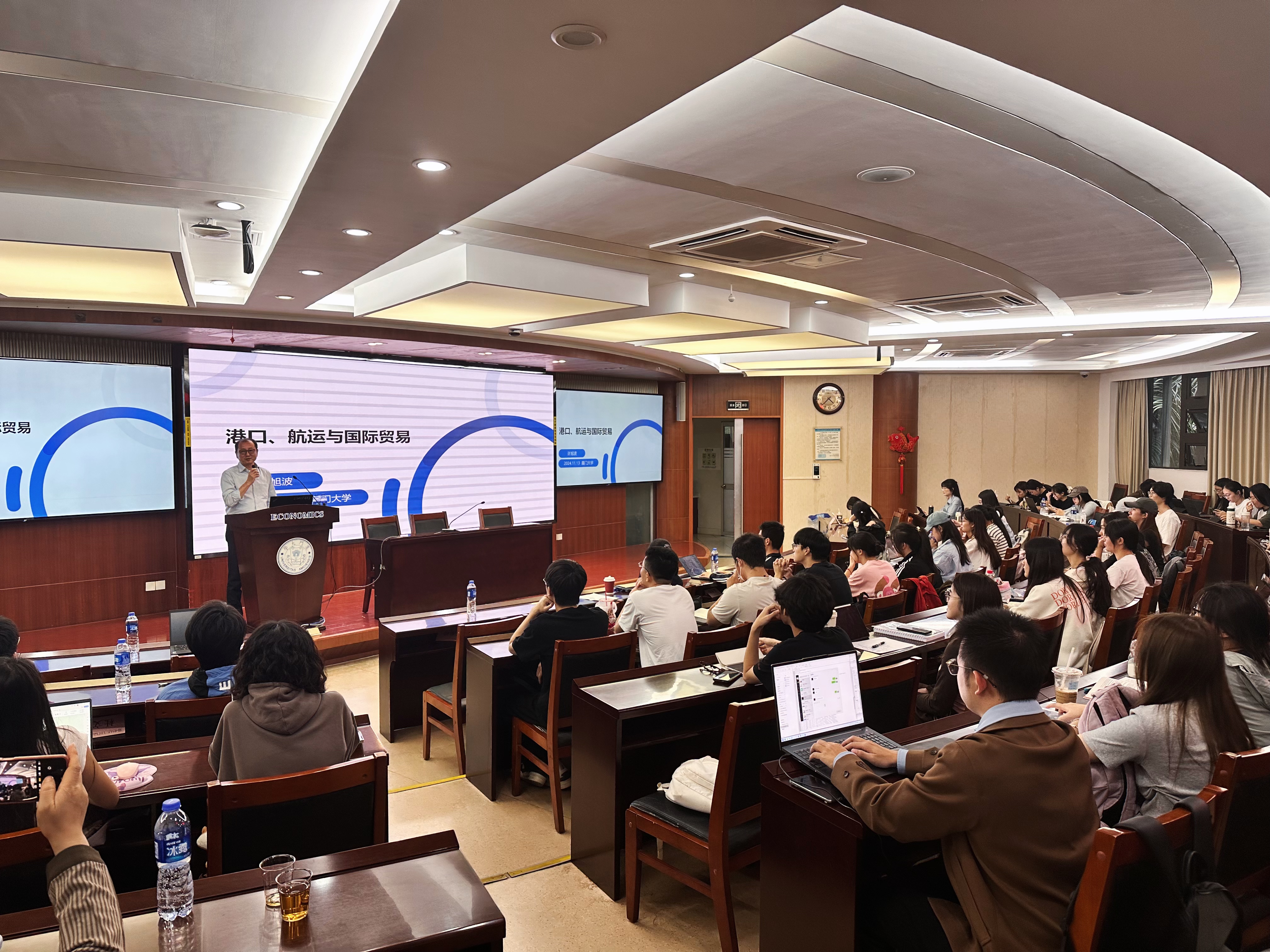 2024年11月13日下午,“国际商务精英论坛第8讲”邀请了现任天津港(集团)有限公司副总裁,历任厦门集装箱码头集团有限公司总经理、厦门自贸区商会会长的许旭波先生,开展了一场题为“港口、航运与国际贸易”的主题讲座,讲座由厦门大学经济学院国际经济与贸易系武力超教授主持。