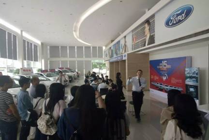 老师同学们刚到达位于厦门市海沧区的厦门丰骏福特4s店,吴咏梅总经理和她的团队就给与老师和同学们热烈的欢迎。吴咏梅总经理在展厅简单地介绍了本次企业参访活动的三个环节——介绍福特汽车及厦门丰骏福特4S店概况、参访汽车销售和售后服务流程、提问和交流。随后,吴咏梅总经理带领老师和同学们进入会议室来进行本次参访的第一个环节。在这一环节,吴咏梅总经理向大家详尽地介绍了三个方面的内容——美国福特汽车的发展史、中美合资长安福特公司的发展史、厦门丰骏福特4S店的发展史。06年,厦门丰骏福特4S店在海沧区比较偏远的位置开业,最初年销售量不到两千台,近几年销售车辆的数量以每年近一千台的数字增长,现在的销售额占厦门市福特汽车销售额的百分之五十左右。这些了不起的业绩与厦门丰骏福特4S店的服务理念分不开。