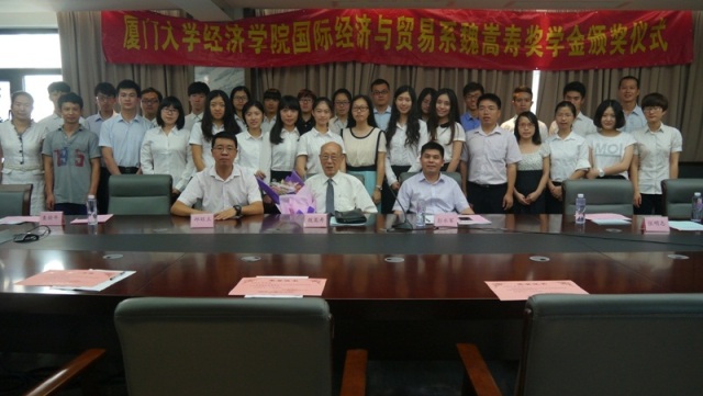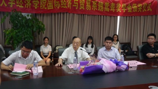 近日,厦门大学经济学院国际经济与贸易系魏嵩寿奖学金颁奖仪式在经济楼N501举行。魏嵩寿奖学金基金会理事会理事长、国际经贸系原系主任、资深教授魏嵩寿老师、经济学院党委副书记邱旺土老师、国际经贸系系主任彭水军教授、国际经贸系张明志教授以及获奖学生出席了本次颁奖仪式。