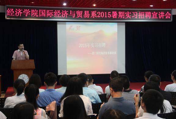 本次国际经济与贸易系2015暑期实习招聘专场宣讲会是厦大国贸系人才培养体系的一个重要环节,是国贸系长期注重理论与实践相结合,培养应用实践型人才理念的又一次创新举措。本次国贸系实习专场宣讲会为同学们展示了七家优秀企业的基本概况,为广大国贸学子提供了许多难得的实习机会,进一步增进了国贸系的集体凝聚力。同时,在本次宣讲会及双向交流之后,参会的招聘单位均对厦大国贸系学生的素质表示十分满意,纷纷称赞厦大国贸系不愧为全国国际贸易本科专业三连冠的团队。招聘单位的代表们还对这样的交流平台表示肯定与感谢,也真诚地希望厦大国贸系学生能通过实习加深对该单位的了解,并最终能够成为他们的同事。