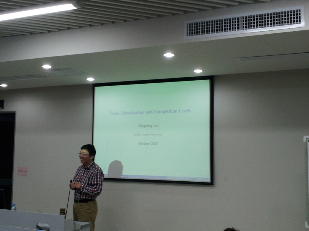2013年10月24日下午5点30分,国际经贸青年学者论坛第57讲在经济学院新楼N301举行。该论坛由杨曦博士主持,彭水军老师、方颖老师、武力超老师等参加了本次讲座。王亚南经济研究院的刘鼎铭博士做了题为“Trade Liberalization and Competition Levels”的精彩演讲。