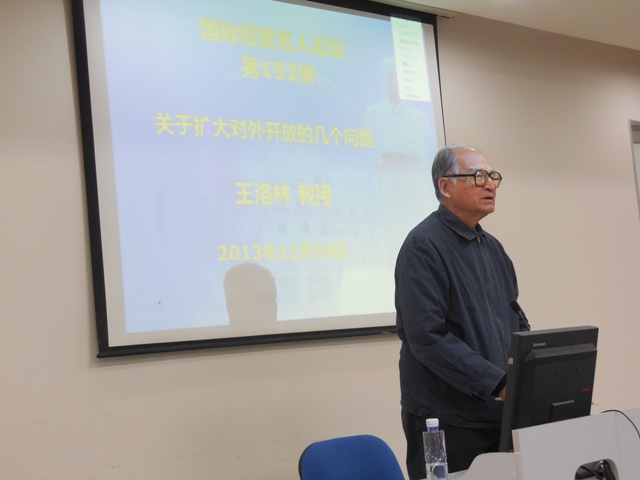 2013年12月20日下午4:30,著名经济学家、中国社会科学院特聘顾问王洛林教授做客国际经贸名人论坛,就 “关于扩大对外开放的几个问题”做了精彩的演讲,讲座由彭水军教授主持,张少军老师、龙小宁老师等参加了论坛。