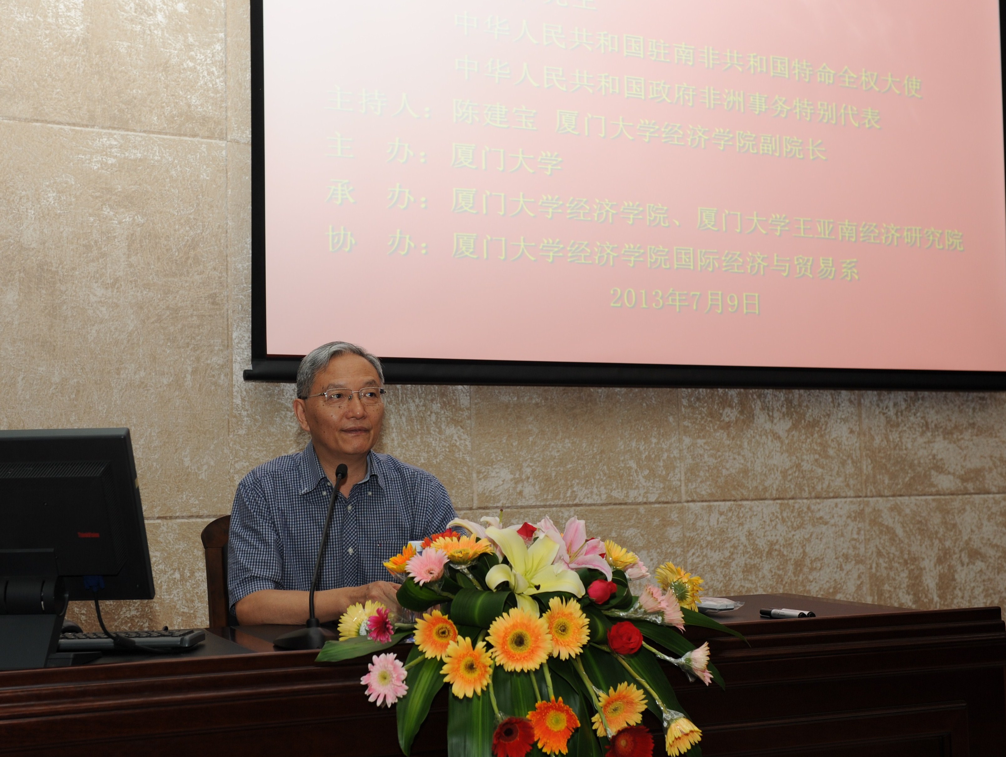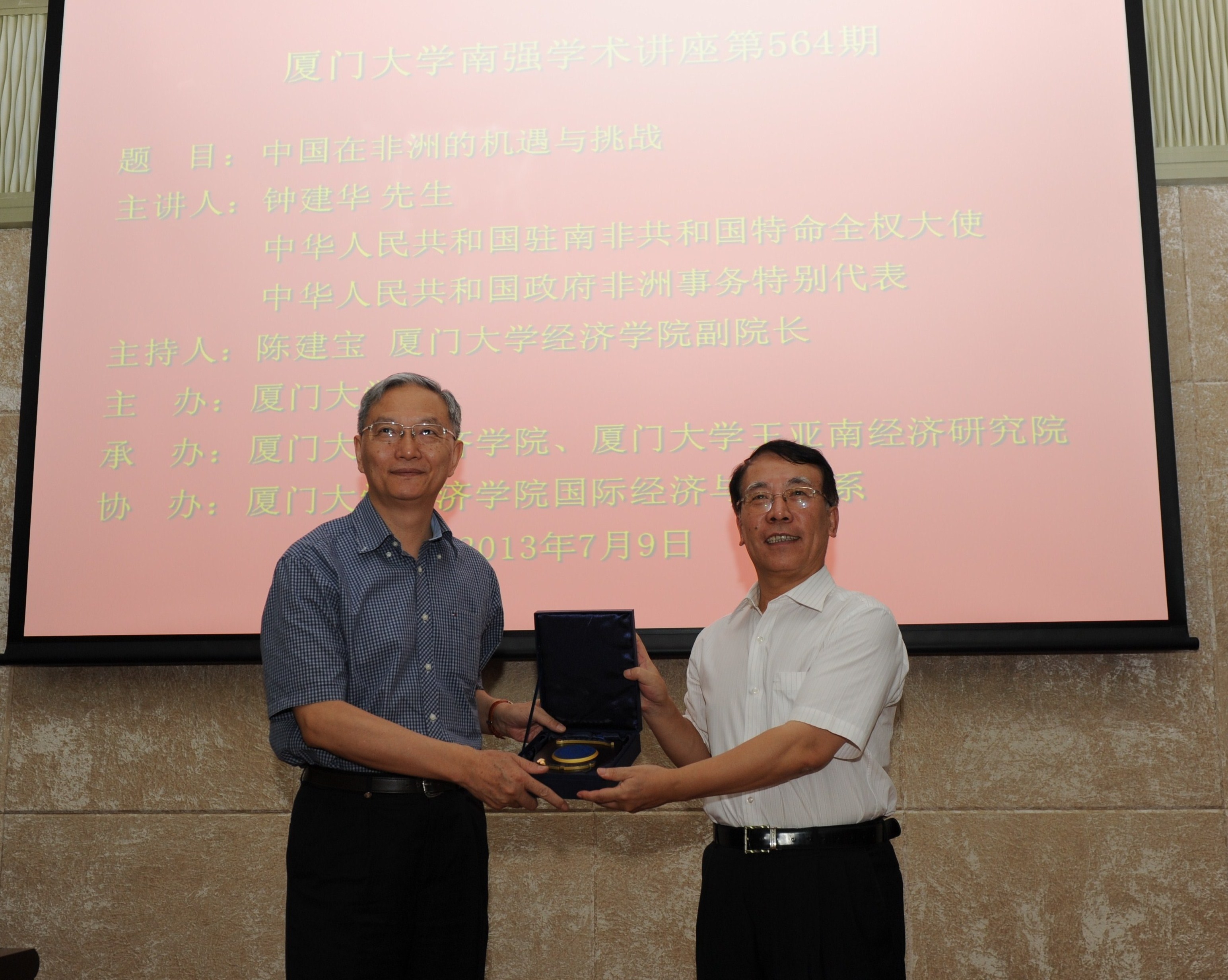 7月9日下午,厦门大学南强学术讲座第564期在经济楼N402室隆重召开。本次讲座邀请到中国政府非洲事务特别代表、中国驻南非前任大使钟建华先生,为我校师生带来题为“中国在非洲的机遇与挑战”的精彩报告。副校长邬大光出席报告会并向钟建华先生颁授了南强学术讲座纪念牌,讲座由经济学院副院长陈建宝主持。