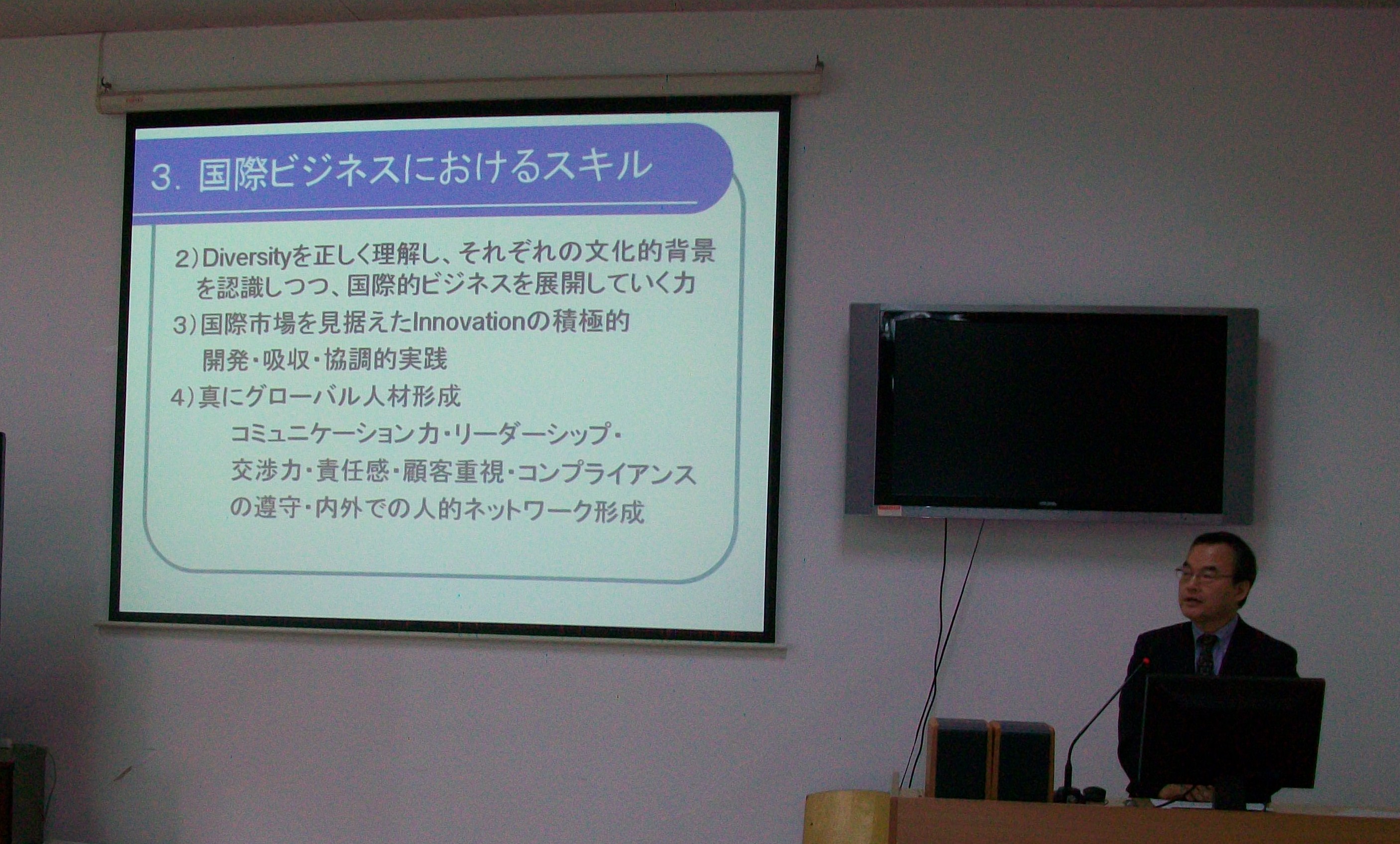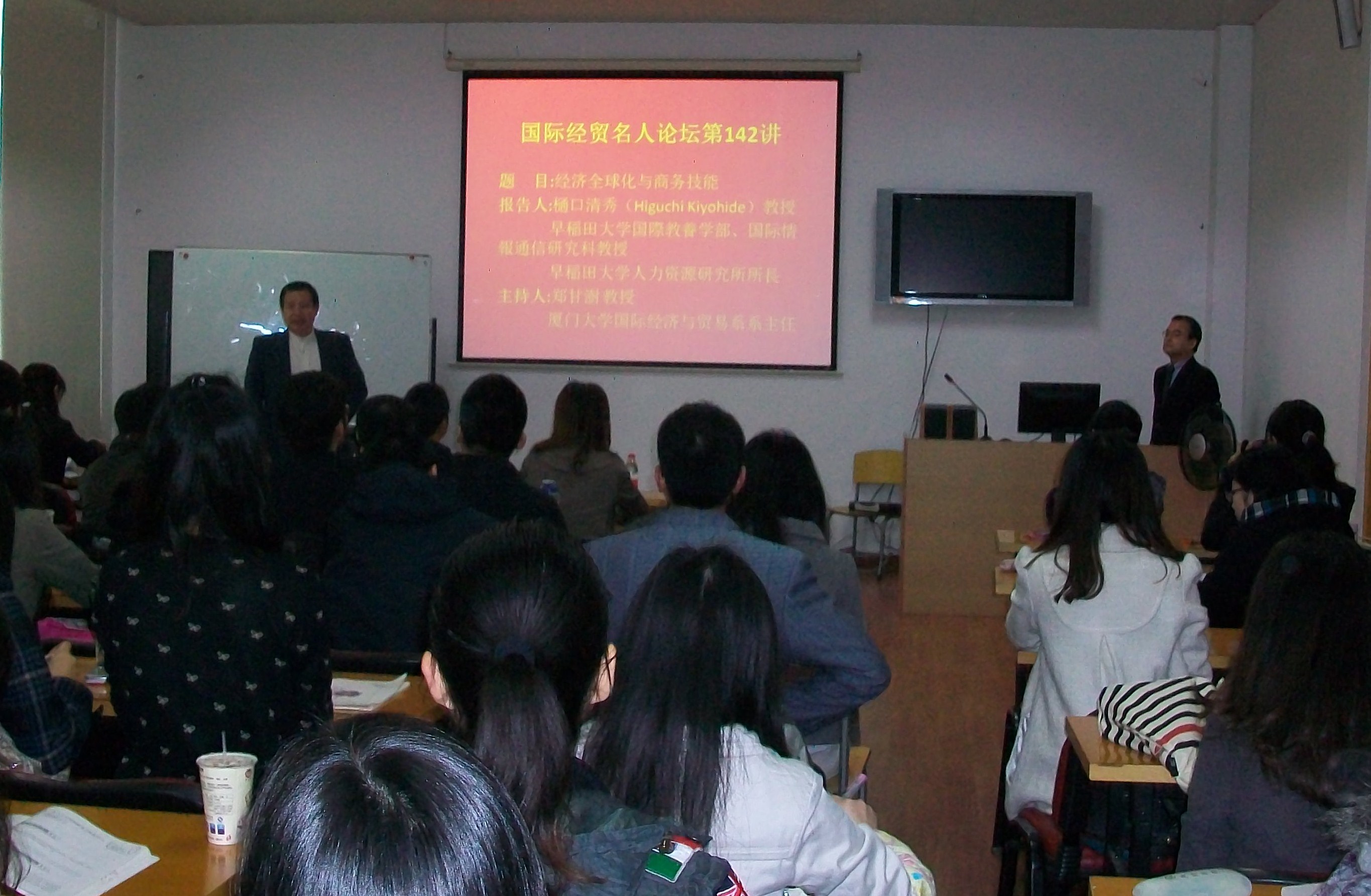 讲座中,樋口教授首先分析了产生经济全球化主要因素,而后回顾了国际贸易理论的发展,重点讨论了Kindleberger的垄断优势理论、Vernon的生命周期理论和Shumpeter的创新理论。樋口教授指出国际贸易发展到今天“创新”成为企业发展的关键,我们要改变对国际贸易的传统认识和理解。企业要在全球化背景下生存,不仅要有好的产品,更重要的是要靠新技术和创新来维持自己的优势地位。当前全球化不断深化,企业本身将面临组织结构的国际化和人才文化背景的多样化,企业需要的商务人才必须具备高超的沟通能力、团队领导能力,能承担责任,必须讲信遵约。樋口教授鼓励同学们要着眼世界,提高自己的吸收和运用新知识的能力,激发自己的创新能力。