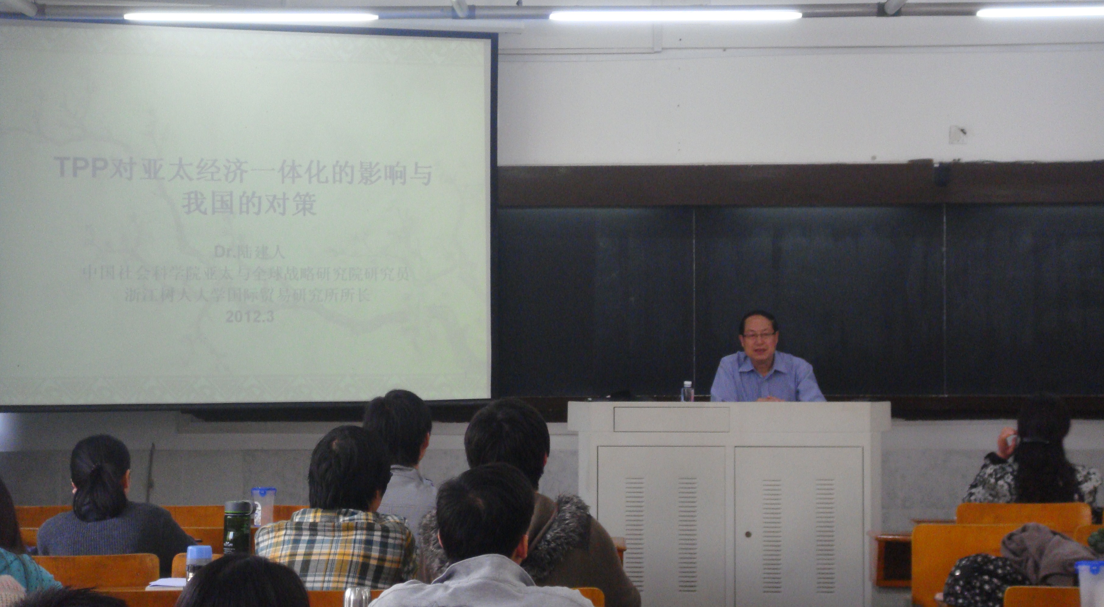 3月30日上午10时,国际经贸名人论坛第143讲暨世界经济博士论坛第46讲于南强二101教室举行。中国社会科学院亚太与全球战略研究院研究员陆建人博士做客本次论坛,并为同学们带来了题为《TPP对亚太经济一体化的影响与我国的对策》的精彩演讲。本次讲座由黄梅波教授主持。