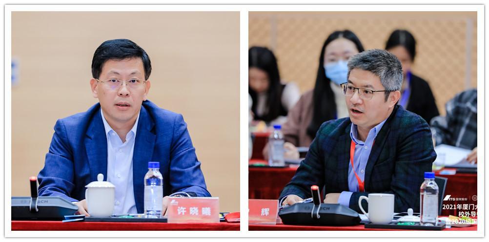 随后,曾辉和韩立军依次发言。曾辉分享了在厦门大学学习国际法和国际贸易知识的美好回忆,表示会尽力在国际商务法律方面给予同学们帮助;韩立军表达了自己能够以校外导师身份回到国贸系感受十分荣幸,希望能够为母校人才培养贡献力量。