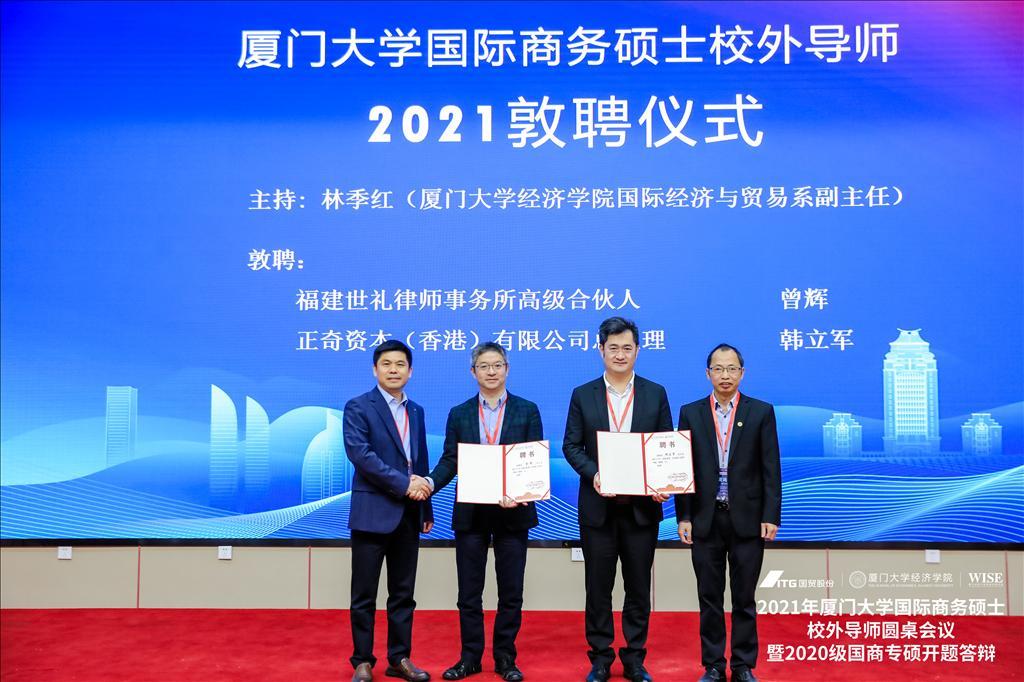 在经济学院国际经济与贸易系林季红教授主持下,厦门大学国际商务硕士新聘校外导师敦聘与实习基地授牌续签仪式举行。黄鸿德、彭水军分别为新聘校外导师——联想控股旗下正奇资本(香港)有限公司董事、总经理韩立军,福建世礼律师事务所高级合伙人曾辉颁授聘书。