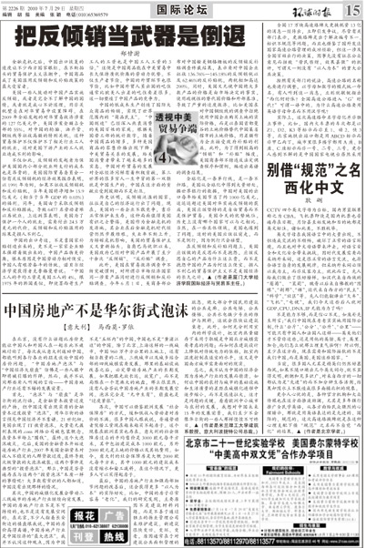 人民日报社主办的《环球时报》于7月29日刊登了我系郑甘澍教授撰写的题为“把反倾销当武器是倒退”的文章。文章指出金融危机后之后,中国的商品成为美国滥用反倾销的最大受害者。文章认为中国的出口奇迹,不是靠国家补贴创造出来的,更不是一家家企业舍本强撑着做出来的。中国产品物美价廉,其根本原因是中国劳动力相对便宜的比较优势。中国的低成本生产创造了国际大众商品的畅销,实现了世界范围内的“商品民主”。“中国制造”已经深入热衷消费的美国百姓的家庭,物美价廉的各种产品给他们带来了真正的实惠。根据美国劳工部的统计数字,随着中国商品的增多,多种美国商品的零售价格出现了下降。中美贸易关系的发展,给美国消费者带来了越来越多的实惠。中国的对外贸易的发展对全球经济同样有着积极的贡献,第三世界的许多穷人一生中穿的第一双鞋就是中国生产的。中国这方面的贡献应受到鼓励而不是打压。