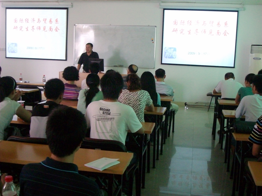 2009年9月17日,国经贸系于经院A座五楼多媒体教室举行2009级研究生新生导师见面会。系主任郑甘澍老师、副系主任张明志老师、部分教师代表出席了会议,会议由张明志老师主持。