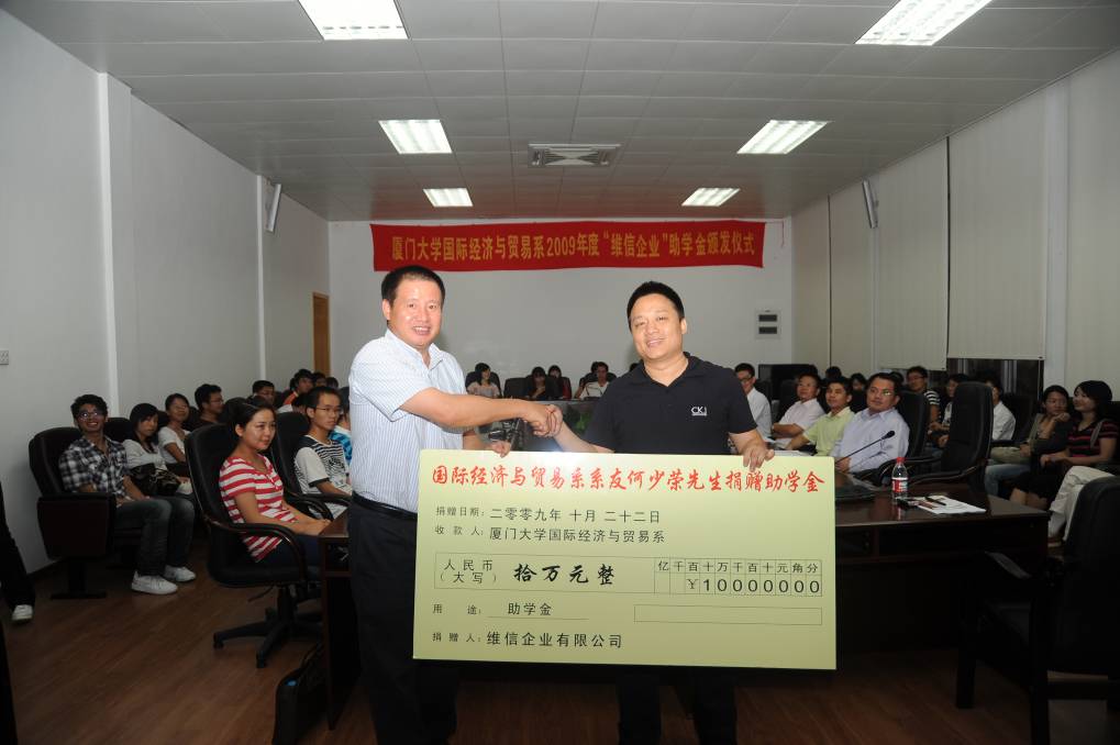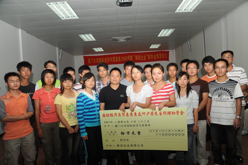 10月22日下午,厦门大学国际经济与贸易系2009年度“维信企业”助学金颁发仪式在经济楼D座310室举行。“维信企业”董事长、国经贸系96届系友何少荣先生,经济学院副院长黄建忠教授、党委副书记孙梓光、国际经贸系主任郑甘澍教授、副主任张明志教授、林季红教授、系主任助理彭水军教授,受助学生,以及国际经贸系师生代表参加了助学金颁发仪式。