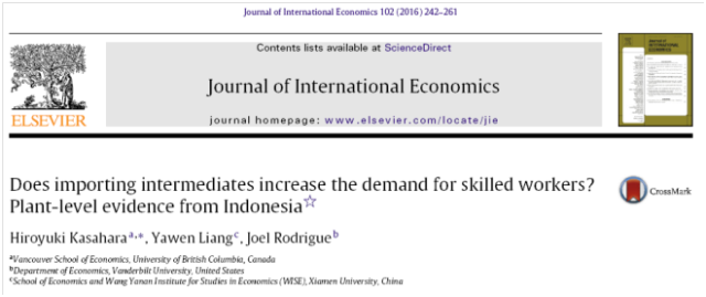 近日,厦门大学经济学院国际经济与贸易系与王亚南经济研究院(WISE)助理教授梁雅雯与加拿大英属哥伦比亚大学Hiroyuki Kasahara教授、美国范德堡大学 Joel Rodrigue教授合作的学术论文“Does Importing Intermediates Increase the Demand for Skilled Workers? Plant-Level Evidence from Indonesia”,于国际贸易学顶级期刊Journal of International Economics 2016年9月刊第102期上发表。