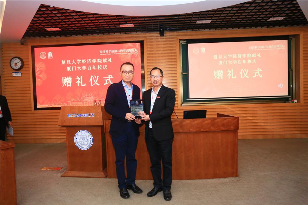 值此厦门大学百年华诞之际,厦门大学各兄弟院校也向厦大发来了贺信、赠礼,论坛现场,复旦大学经济学院院长、文科资深教授张军,厦门大学经济学院党委书记黄鸿德分别作为兄弟院校和厦门大学经济学科代表,上台进行赠礼仪式并合影。