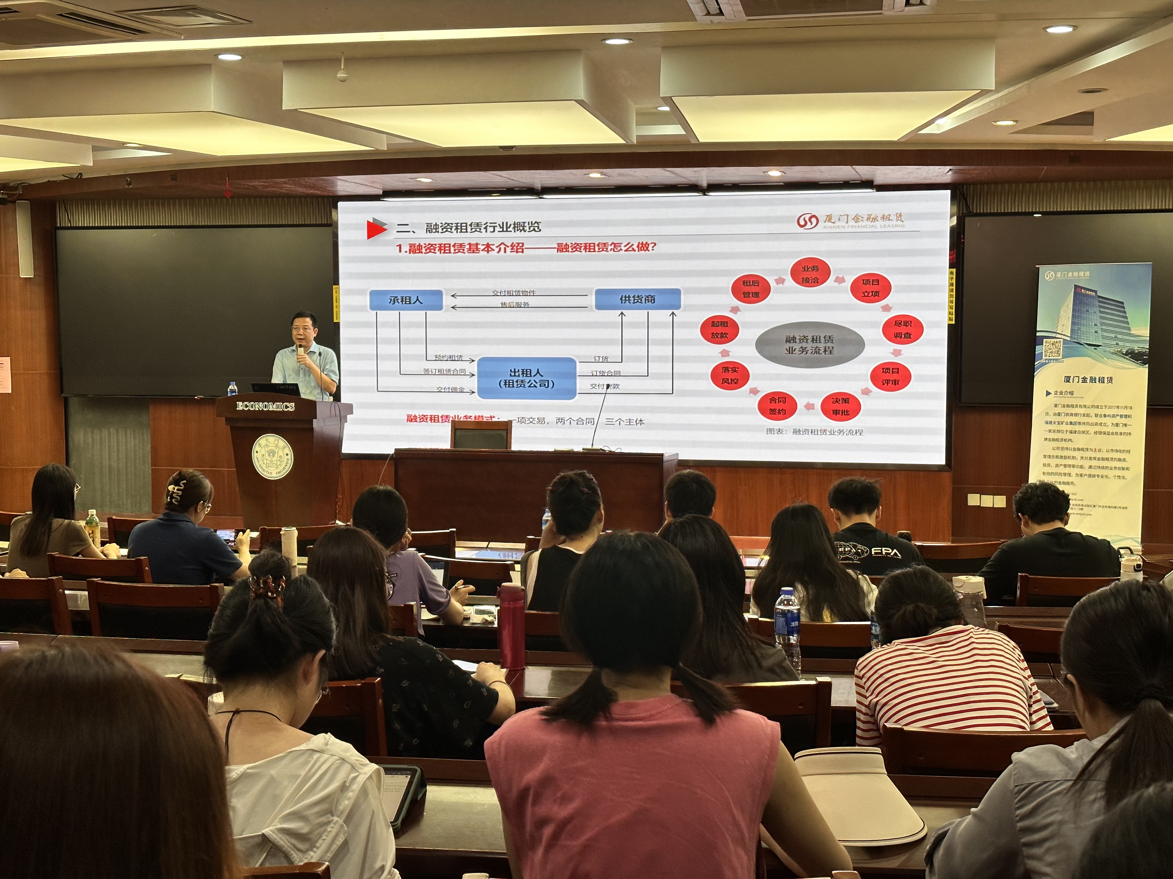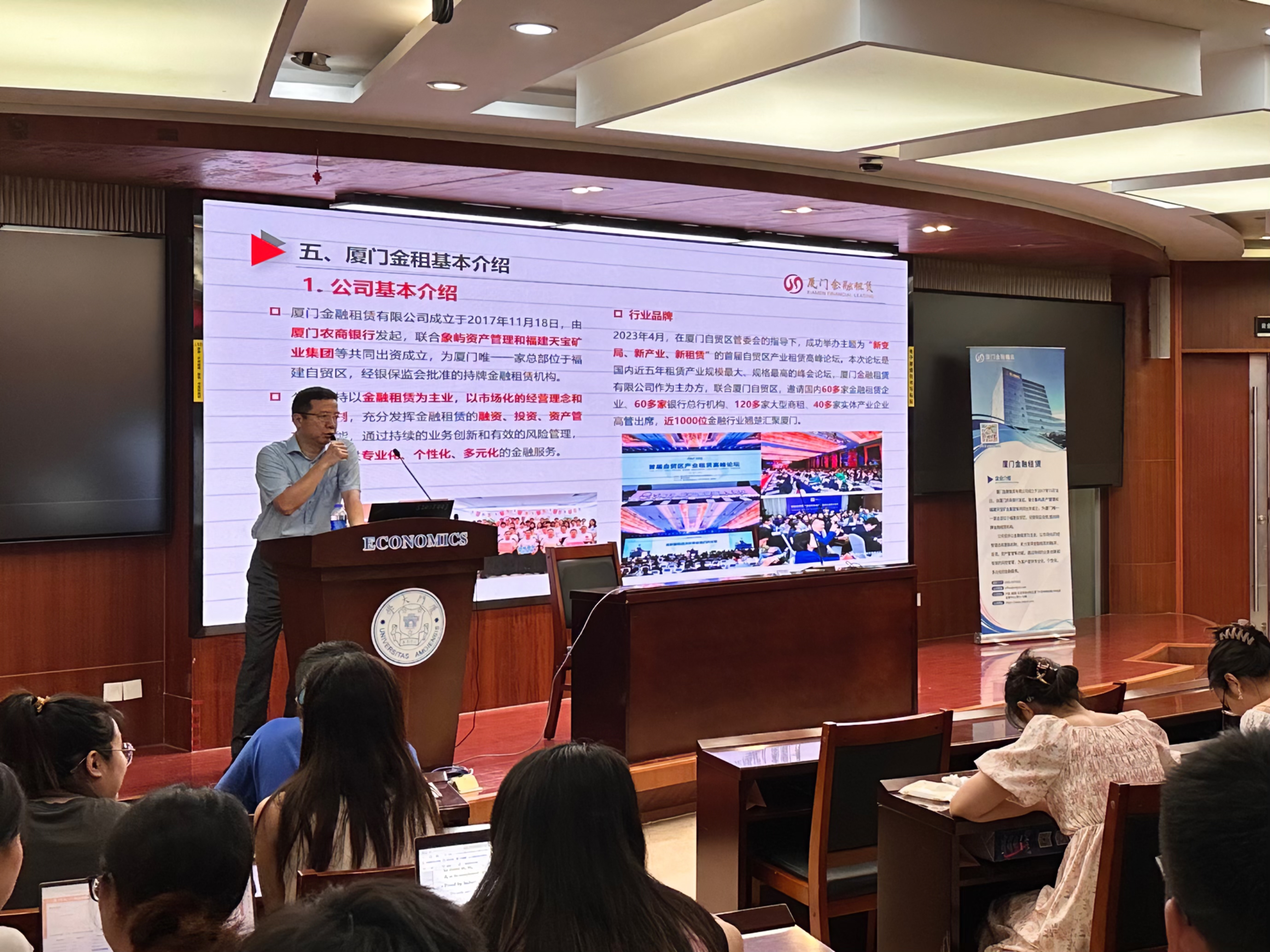 2023年9月20日,厦门大学经济学院国际经济与贸易系国际商务精英前沿与实践系列讲座如期举办,厦门金融租赁有限公司党支部书记、总裁、自贸区商会融资租赁专委会主任委员吴稷先生做《新经济变局下的租赁行业发展机遇与挑战》主题讲座,厦门大学经济学院国际经济与贸易系武力超教授主持此次活动。