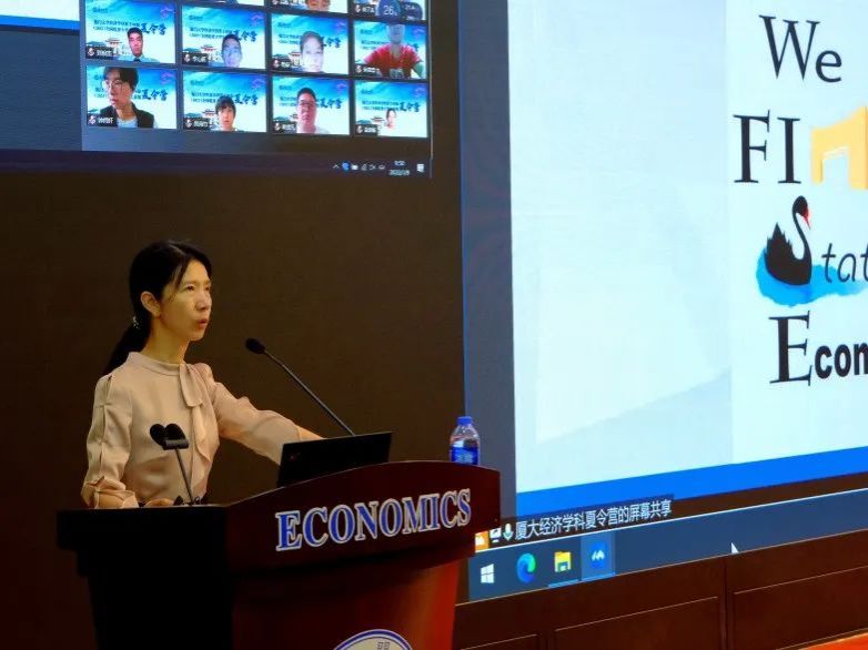 牛霖琳教授随后为各位营员介绍了厦大经济学科历史与研究生培养。牛霖琳教授从学科特点和办学水平出发,详细地为营员们介绍了经济学科高标准、严要求的管理要求和阶段性、全方位的培养体系,以及厦大经济学科历史悠久、国际化视野、 文理交叉、教学严谨的鲜明特点。牛教授以风趣幽默的演讲方式,用学生根据切身学习经历而创造的《高微必过歌单》、《八高的千层套路》等多媒体作品为例,生动地为大家展示了厦大经济学科研究生培养的多个侧面。